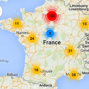 Problème restant : si plusieurs personnes donnent la même adresse générique (par exemple uniquement le nom d'une ville), alors plusieurs icônes peuvent être masquées par la dernière ajoutée. Une solution pourrait alors d'utiliser la fonction "markercluster=on". Principal inconvénient : elle n'est disponible qu'avec le fond de carte google. Exemple :