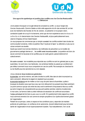 - « Une approche systémique et positive des conflits avec les Cercles Restauratifs : Lien Viméo / Téléchargements: SD / HD / Texte pdf »